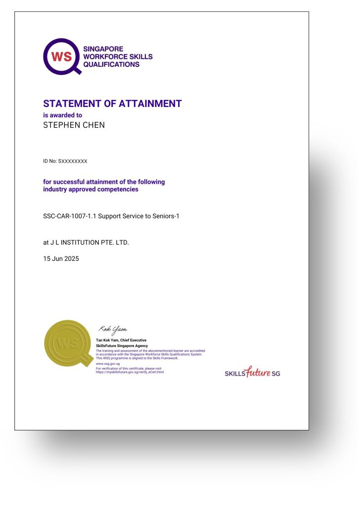 This course is recognised across the eldercare, community care, and healthcare sectors — helping you start or advance your caregiving career. It is part of the Workforce Skills Qualifications (WSQ) framework and is SkillsFuture Credit-eligible.